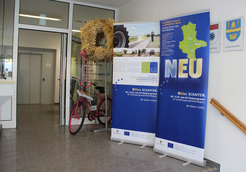 Eines der ausgestellten Erfolgsprojekte ist die Befestigung des "Olvenstedter Weges" mit mulitfunktionaler Nutzung. Die aus ELER-Mitteln finanzierten ländlichen Wege ermöglichen einen wesentlich schnelleren Zugang zu landwirtschaftlichen Betriebsstätten. Durch die Verbesserung der Infrastruktur werden aber auch immer mehr Aktivtouristen mit dem Rad oder zu Fuß angelockt, die entlang des touristisch attraktiven "Holunderradweges" einige der schönsten Leader-Projekte der Region besichtigen können.